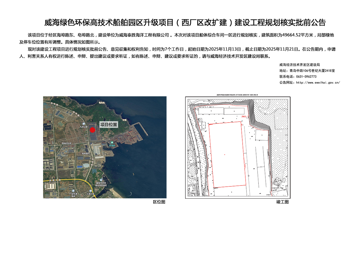 威海绿色环保高技术船舶园区升级项目(西厂区改扩建)建设工程竣工规划核实批前公告