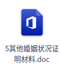 5 | 其他婚姻状况证明材料 | 原件 | 纸质 | 申请人自备 | 1 | 特殊情形提交:当事人声明离异、丧偶或者声明的婚姻状况与婚姻登记机关核查信息不一致的,应当向登记机关提交能够证明其声明真实性的离婚证、 加盖档案保管部门印章的 离婚登记档案、法院生效司法文书、配偶居民死亡医学证明(推断)书等。 |